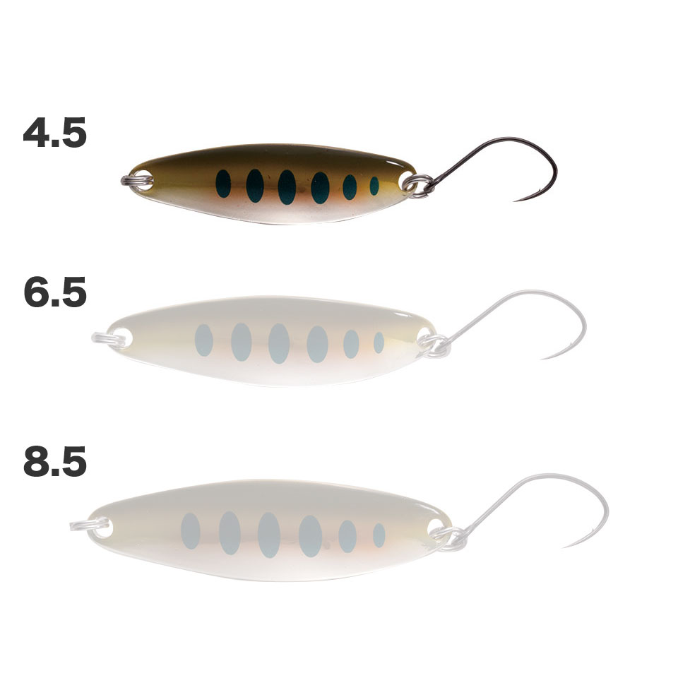アップクロス、フォール、ダウンクロス、スイング、カーブフォールなど、様々な状況下でリトリーブスピード問わず常にアクションをし続けることを追求しました。そのため、ツインクルスプーンNAは、ボディの先端と後端を薄身に仕立て、文字通りエッジを効かせたテーパードボディを採用。わずかな水流変化に対しても敏感に反応し、スローでも確実に水流を掴み、どんな時も静止することなく水中を舞い踊ります。