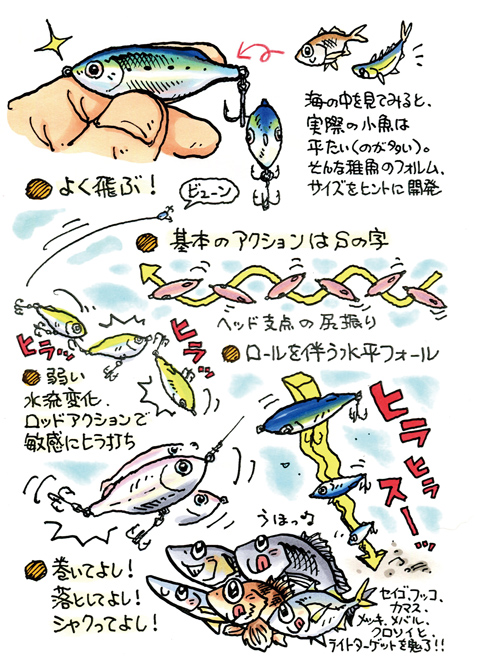 ハイアピール扁平ボディがもたらすのは、飛距離、ロールを伴う水平フォール、スローでのテールスイング、そして、弱い水流変化でも反応するヒラ打ちアクション。見た目に似つかわしくない、高運動性シャッド型シンキングペンシルです。