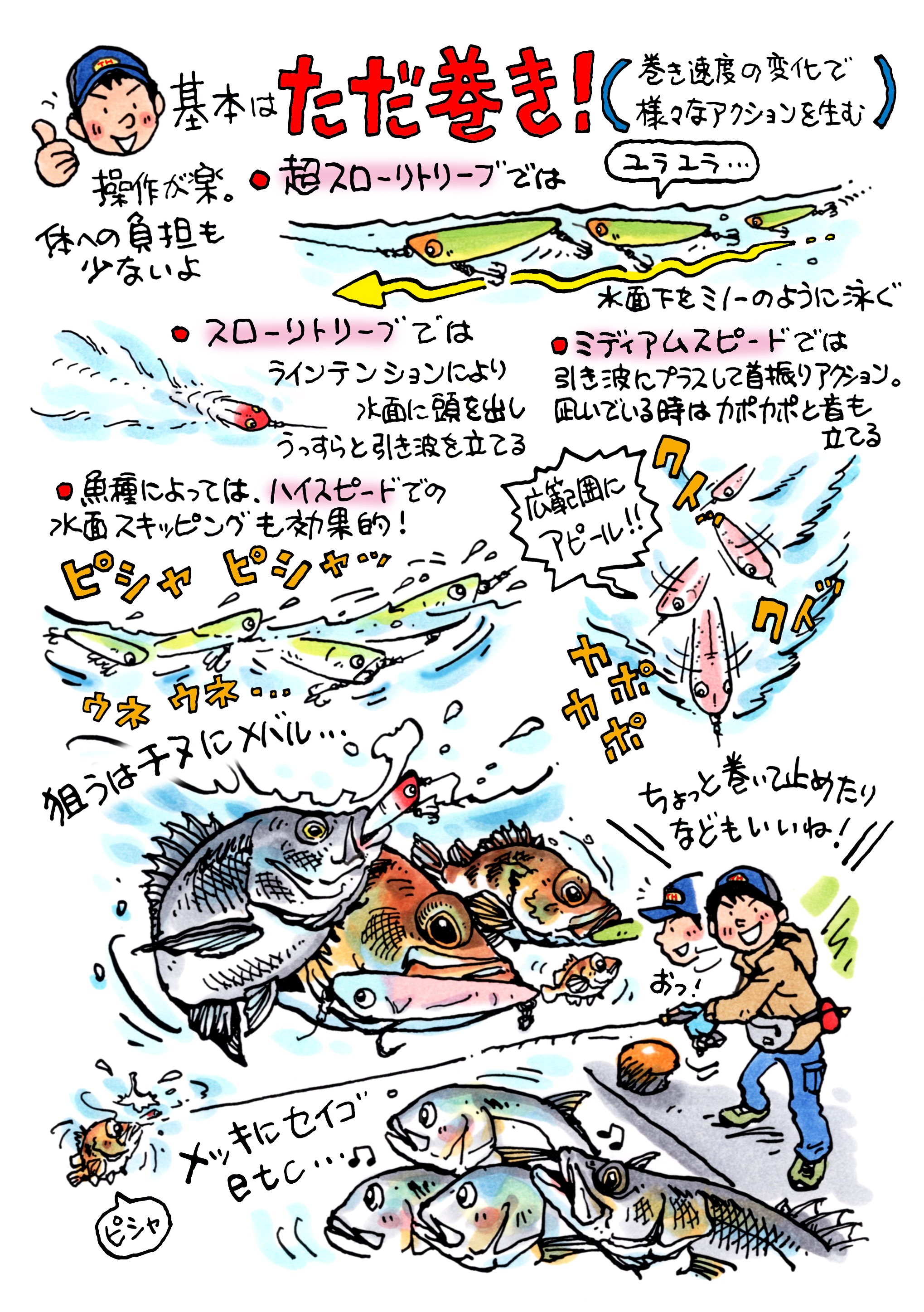 誰でも簡単。ただ巻きで、水面での興奮ゲームを楽しめるトップウォータープラグ。超スロー領域では水面直下をミノーの様に泳ぎます。スピードを上げるにつれ、スロー領域に入ると水面に顔を出し引き波を立て、さらにスピードを上げると、首振り+引き波へとミディアムスピードに向けアピールを強めます。ロッドアクションではテーブルターンや小気味良いポップサウンドを奏でることも可能。抵抗の少ないボディなのでロッドワークはあくまでもソフトに。