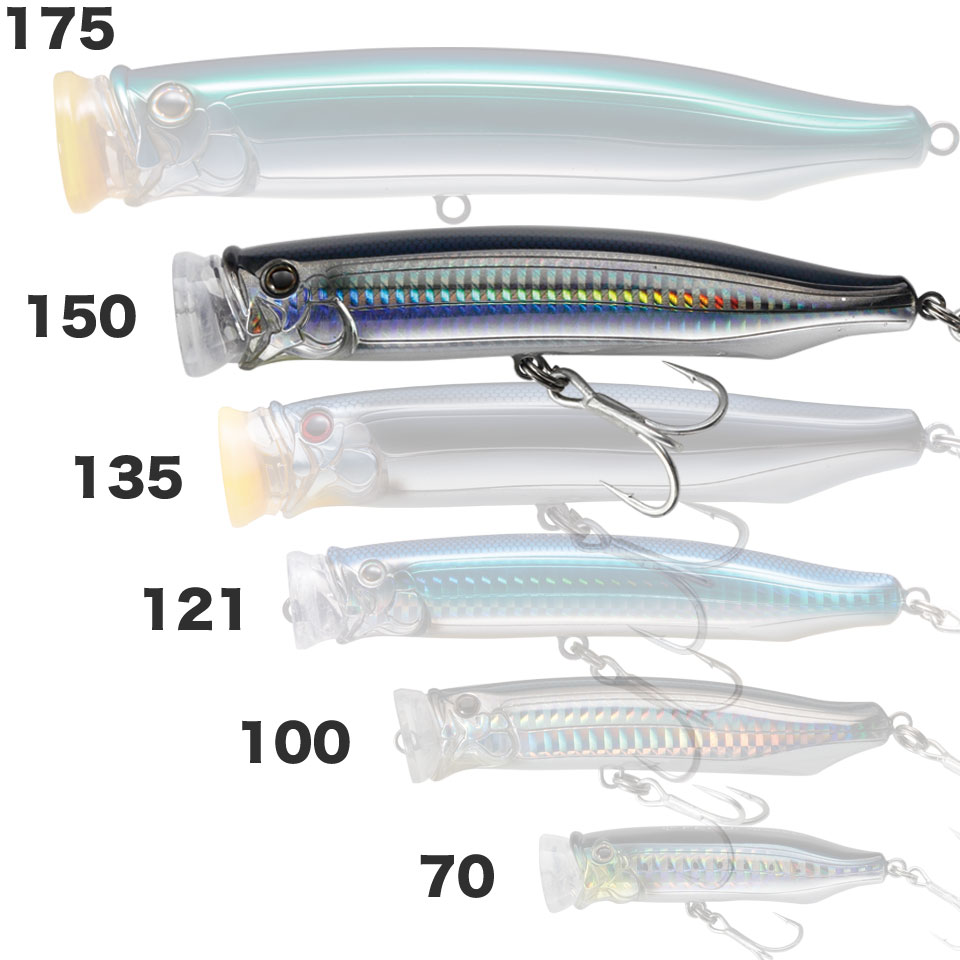 軽いジャークでもポップサウンドを奏でるマウスカップは音質重視。水面ぎりぎり、ほぼ直立の浮き姿勢は吸い込みやすく、ピンスポットの集中ポッピングも可能に。ボリューミーなボディと絶妙なウェイトが魅力。オフショアはもちろん、ショアからの大型青物狙いにも対応します。ステイ時においても波と同調しない自然な揺らぎをもたらすR-Unit を搭載し誘いのパターンが広がります。フック付きモデルと、お好みのフックをつけられるフックレスモデルのラインアップです。